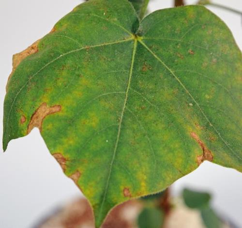 Los síntomas empiezan con una clorosis intervenal de color pálido amarillo-verdoso en hojas jóvenes y de mediana edad. Luego se extiende para cubrir toda la hoja. Posteriormente necrosis se extiende del margen hacia las zonas intervenales.