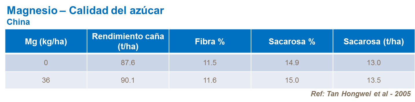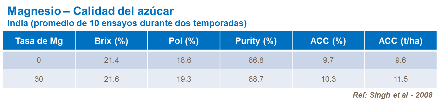 Potasio tiene una función clave en la síntesis de azúcar y su translocación en la caña. También mejora la calidad del azúcar incrementando los niveles de Pol y °Brix y reduciendo el contenido de fibra. Sin embargo, absorción de lujo tendrá un efecto negativo en la cristalización de azúcar.