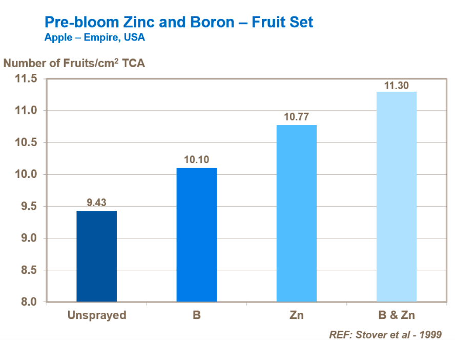 Pre-bloom applications of zinc can help aid the recovery of winter injured trees and also ensure supplies are not limiting during flowering and new fruit formation, as trials with Empire apples in Us show.