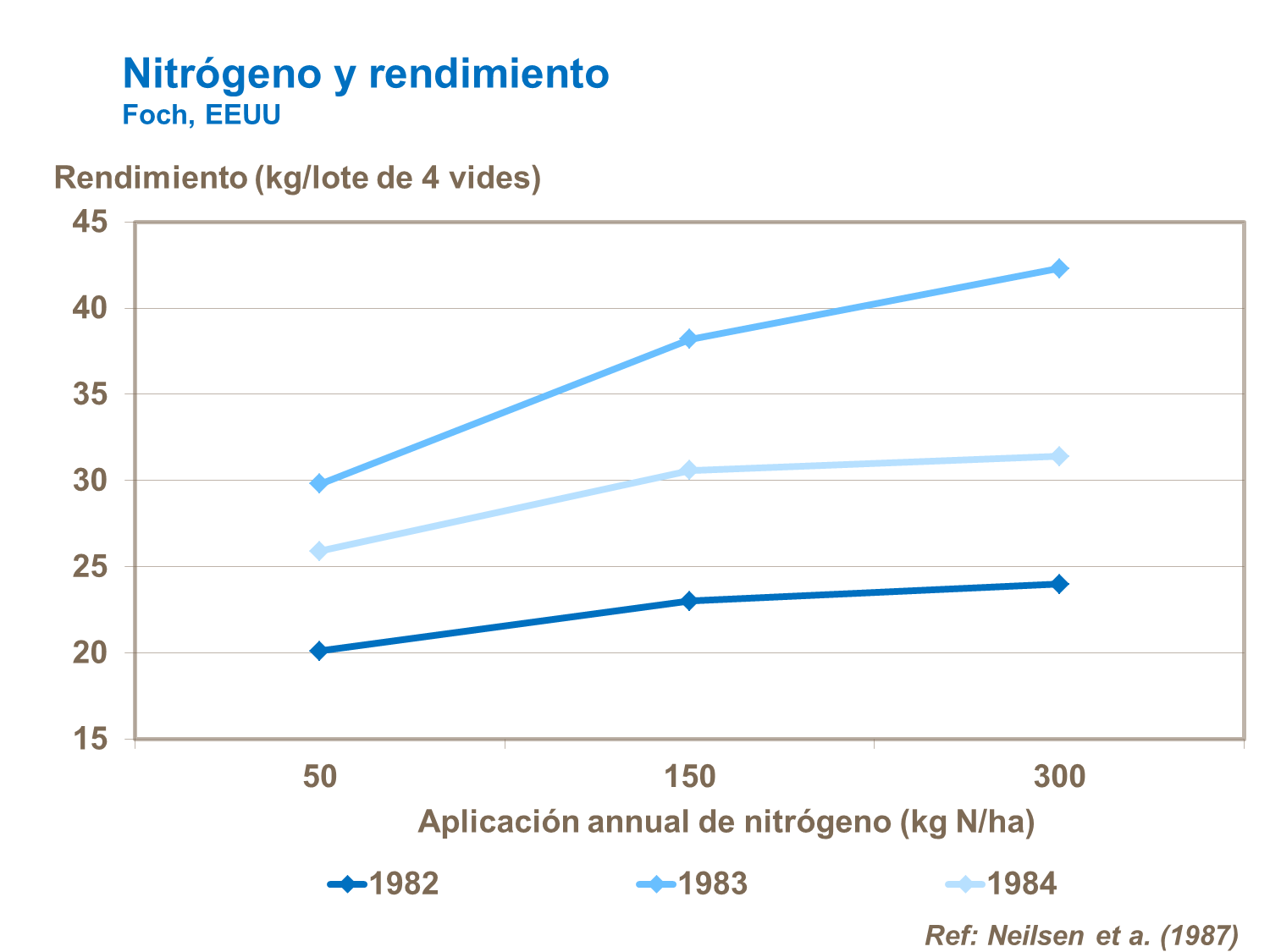 Es uno de los elementos más importantes en la producción de uva. Promueve un crecimiento temprano y fuerte y buen peso en racimo y uvas. Sin embargo, demasiado nitrógeno retrasará la maduración e incrementará el riesgo de contraer enfermedades cuando se acerca la cosecha.
